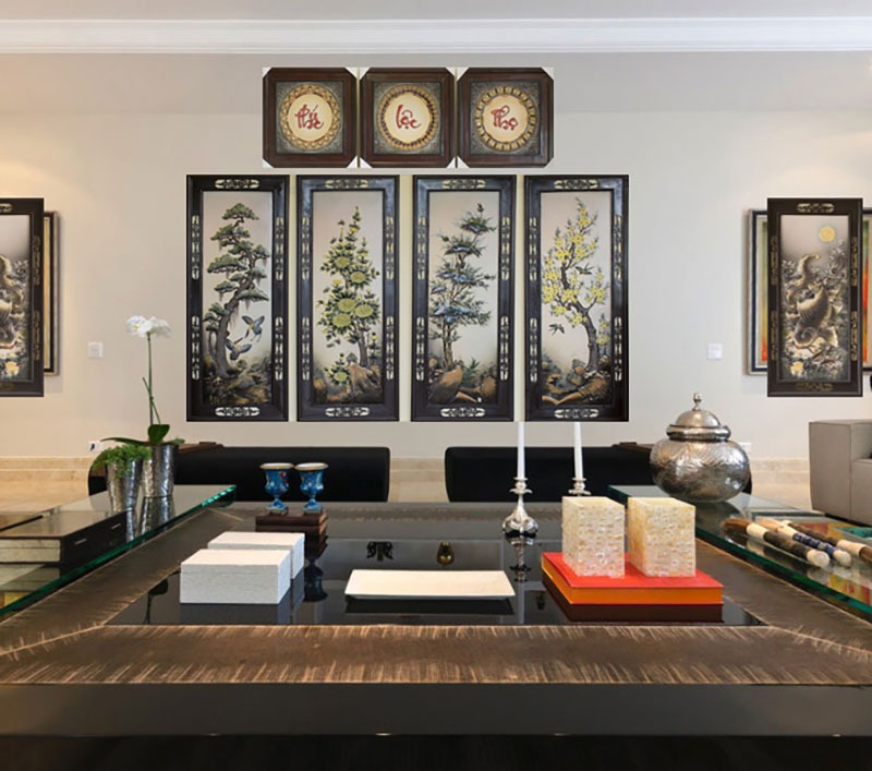 Bạn có thể treo bộ tranh từ trái sang phải theo lối hiện đại hoặc từ phải sang trái theo lối cổ điển. Chuẩn bị thước thủy hay còn gọi thước lovi cân bằng, đinh vít móc màn + nở, khoan, thang.